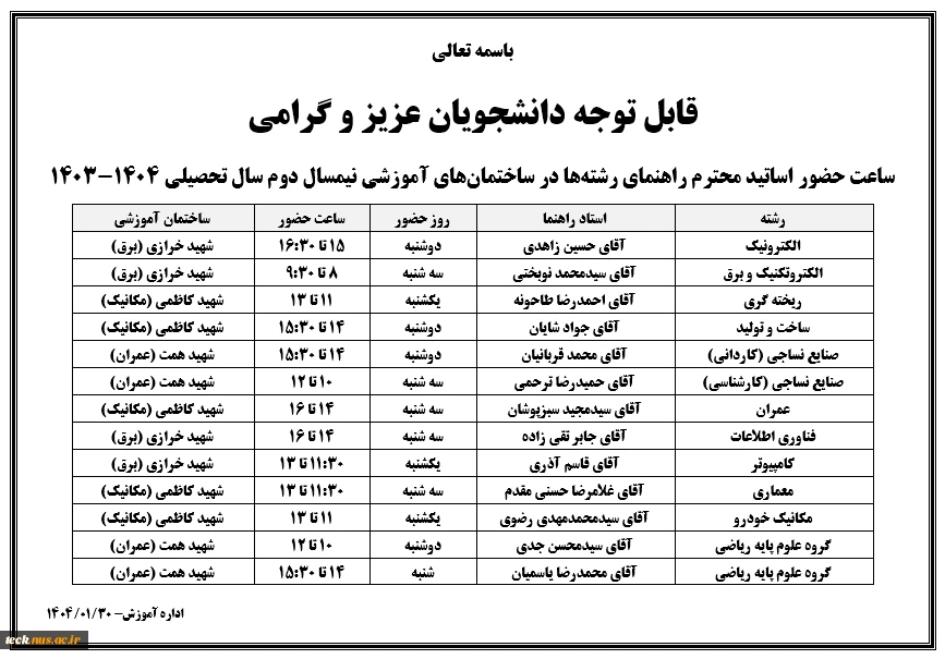 امتیاز دهید : ساعت حضور اساتید محترم راهنمای رشته ها در ساختمان های آموزشی نیمسال دوم سال تحصیلی 1404-1403 2 شنبه 30 فروردین 1404 ساعت 15:57